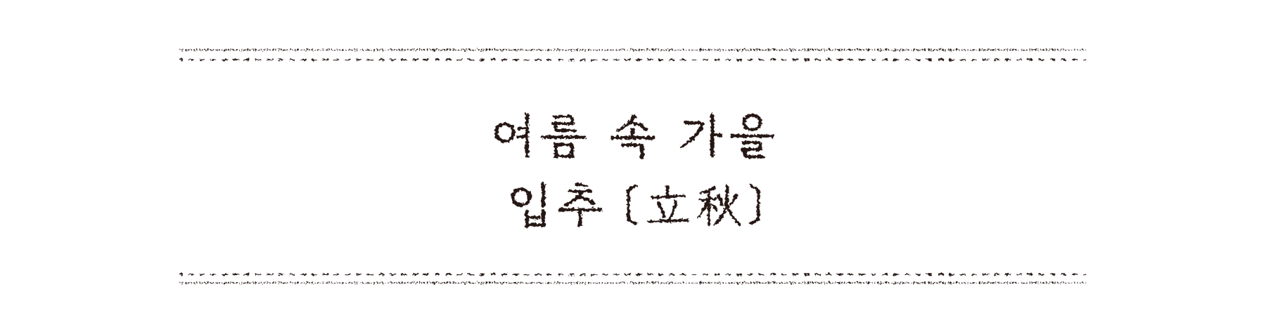 안녕하세요, 님. 가을의 첫 절기, 입추입니다. 말 그대로 ‘가을에 들어섰다’는 뜻이지만 아직은 여름 기운이 가득한 날들이 이어지고 있습니다. 여름의 상징이자 전령인 매미의 울음 소리가 여름의 끝을 알리듯 더욱 깊고 세차게 울려 퍼집니다.