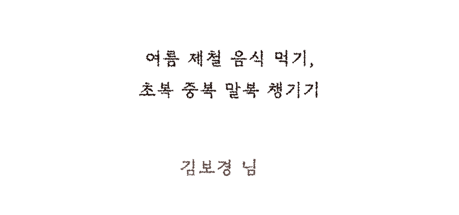 오늘부터 입동 전까지를 가을이라 한다고 하지만, 아직은 더위가 한창입니다. 8월 9일 말복도 채 지나지 않은 지금, 삼복 더위가 여전히 이어지고 있습니다. 본격적인 가을을 맞이하기 전, 호호당 레터 구독자 여러분께서 보내주신 ‘여름을 지혜롭게 보내는 법’을 함께 나누어보아요. |