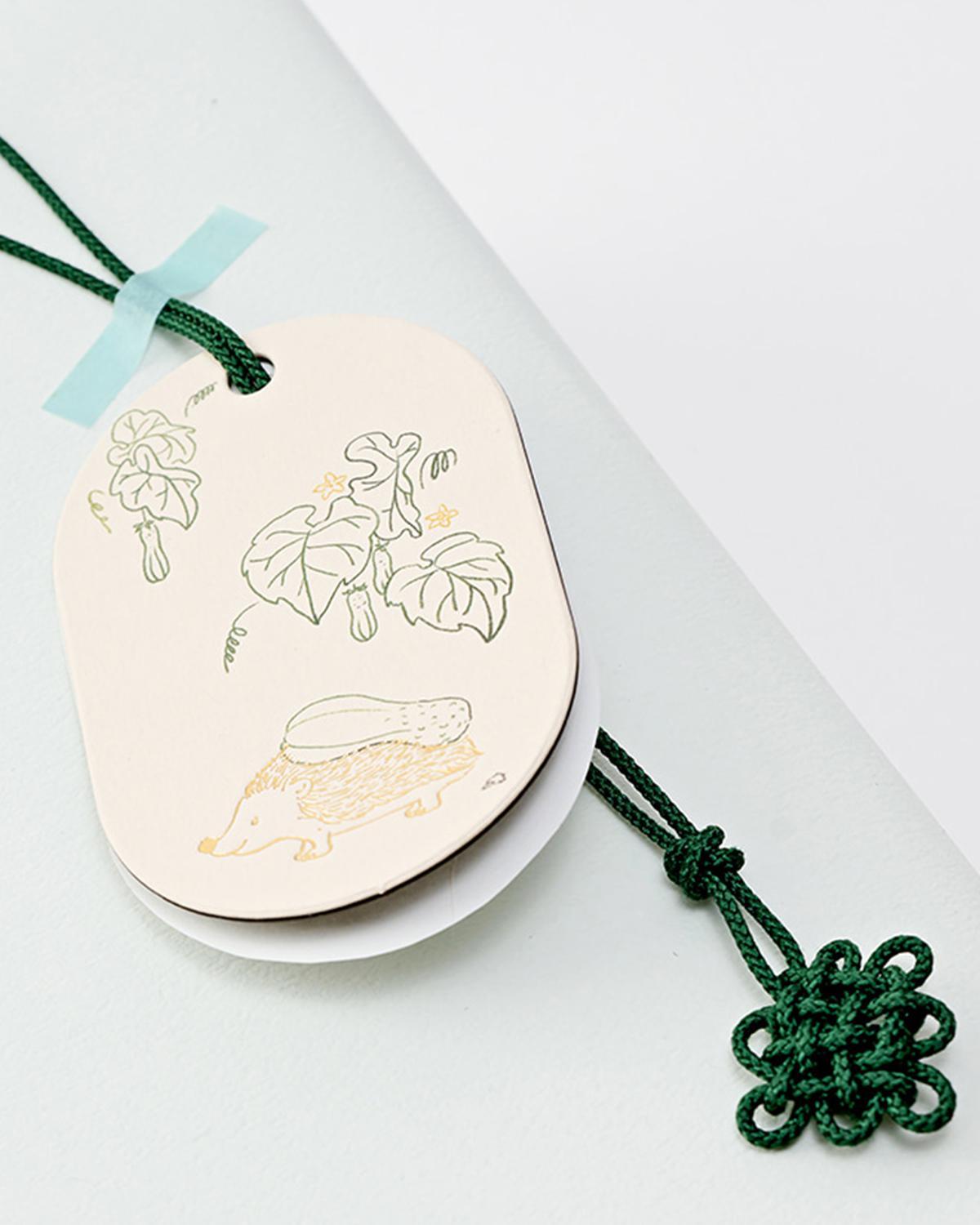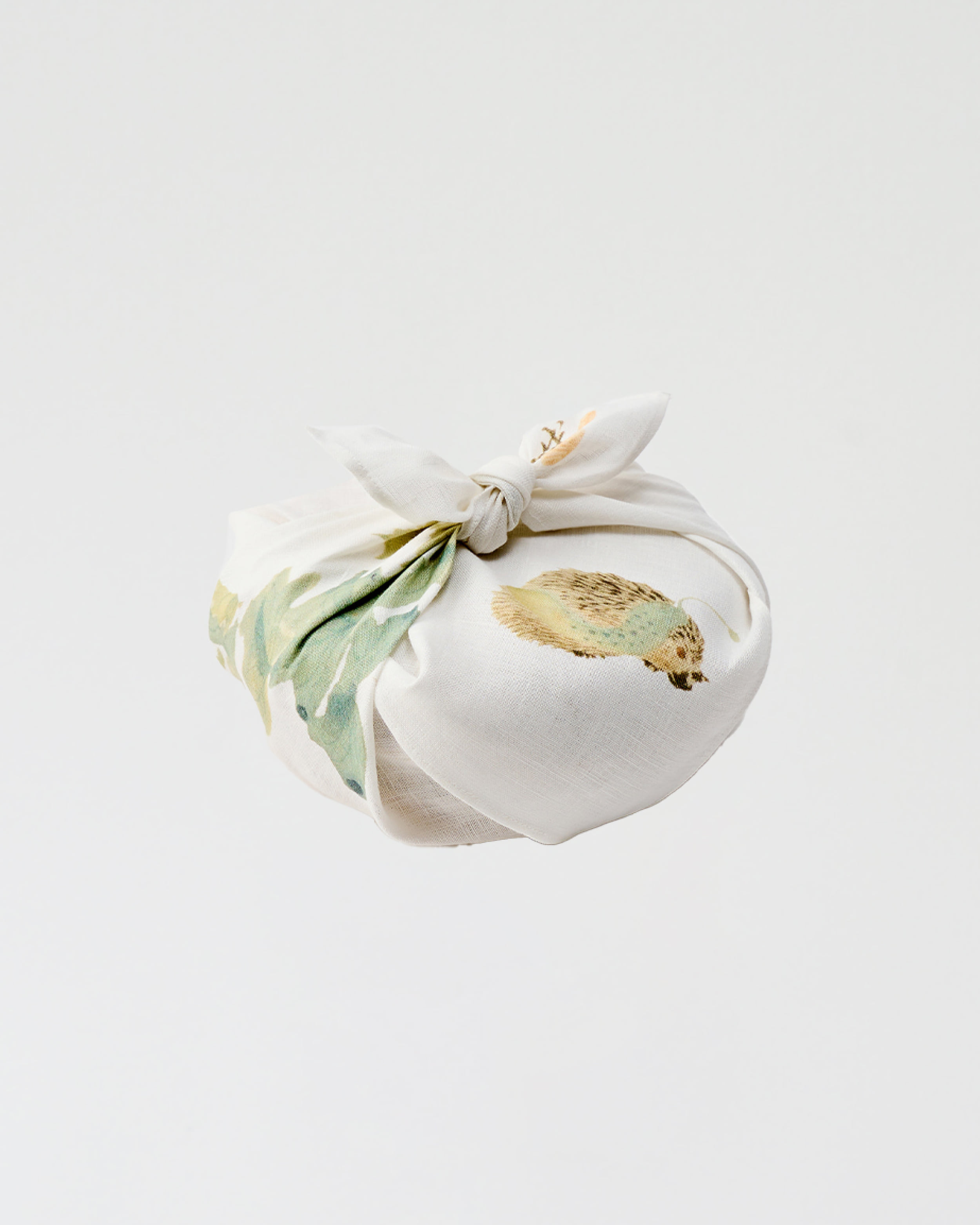 작품 속 오이 넝쿨과 고슴도치를 담아낸 보자기입니다. 얇은 모시 면으로 제작되어 수수하면서도 기품이 있으며, 복을 기원하는 선물 포장은 물론 일상 속 다양한 패브릭으로도 활용할 수 있습니다.
