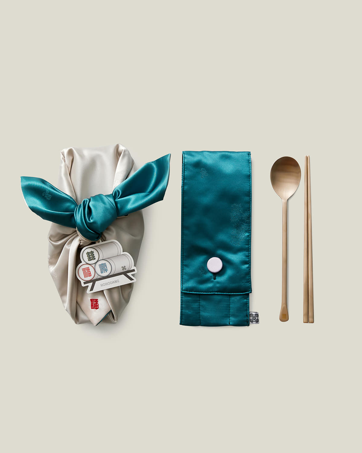 '기쁘게 사세요, 건강하세요, 다복하게 사세요' 다정한 인사처럼 새겨진 자수는 전하는 이와 받는 이 모두에게 행복을 전합니다. 보자기 모서리에는 ‘희·수·복’ 자수가 놓여 있으며, 유기 수저 끝에는 희·수·복 각인 서비스를 더해드립니다.