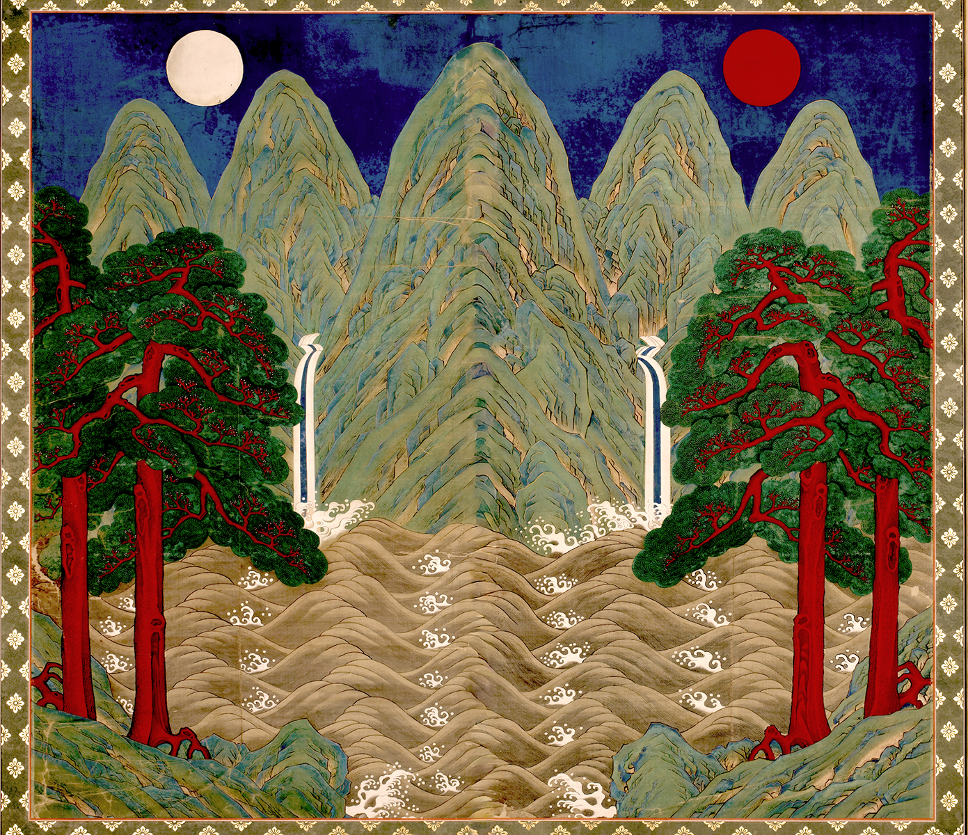 오늘의 그림은 필자 미상의 일월오봉병입니다. 다섯 봉우리에 해와 달, 푸른 소나무와 물결이 어우러진 화면은 단순한 장식이 아니라, 오래도록 화평과 장수를 기원하던 상징의 세계를 담고 있습니다. 해는 양, 달은 음을 상징하며, 두 빛이 나란히 그려질 때에는 “천하가 화평하고 위아래가 창성하며, 오래도록 장수한다”는 뜻이 담깁니다. 다섯 봉우리는 오행을, 산과 물은 양과 음의 기운을, 사철 푸른 소나무는 장생의 바람을 품고 있어요. 왕의 자리 뒤를 지켰던 이 그림은 조화롭고 평안한 세상이 오래 이어지기를 바라는 마음의 상징이라 할 수 있습니다. |