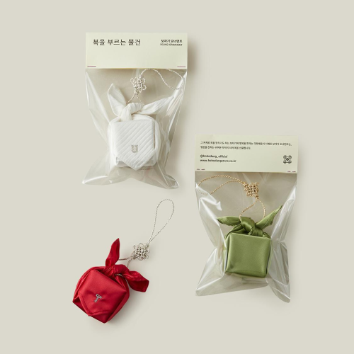 무료 자수 서비스로 가족의 이니셜을 새겨 보세요. 양단의 고운 결과 보자기의 단아한 형태가 어우러져, 작은 오너먼트 하나만으로도 은은한 명절의 기운이 퍼집니다. 가방이나 물건 위에 네임택처럼 달아두거나 올려두어도 멋스럽게 활용할 수 있습니다.