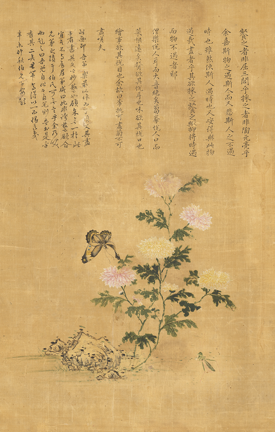 오늘 소개해드릴 그림은 바로 그 국화를 주제로 한 ‘국접도(菊蝶圖)’입니다. 풍산 홍씨 네 형제가 함께 완성한 이 그림은 막내 홍낙최가 그림을 그리고, 둘째 홍낙명이 화제를, 셋째 홍낙삼이 글씨를, 맏형 홍낙성이 발문을 쓴 작품으로, 가족의 정과 문인으로서의 품격이 오롯이 담겨 있습니다. 화면 속 국화 주변에는 나비와 여치가 머물러 있는데, 나비는 떠나지 못하고 여치는 감탄하는 듯 머문 모습이지요. 가을날처럼 서정적인 이 장면은, 계절의 고요한 아름다움과 ‘수수하고 차분한 것의 귀함’을 일깨워줍니다. 찬 이슬이 내리는 아침, 국화 향이 스며드는 계절 속에서 작은 여유를 느껴보시길 바랍니다. |