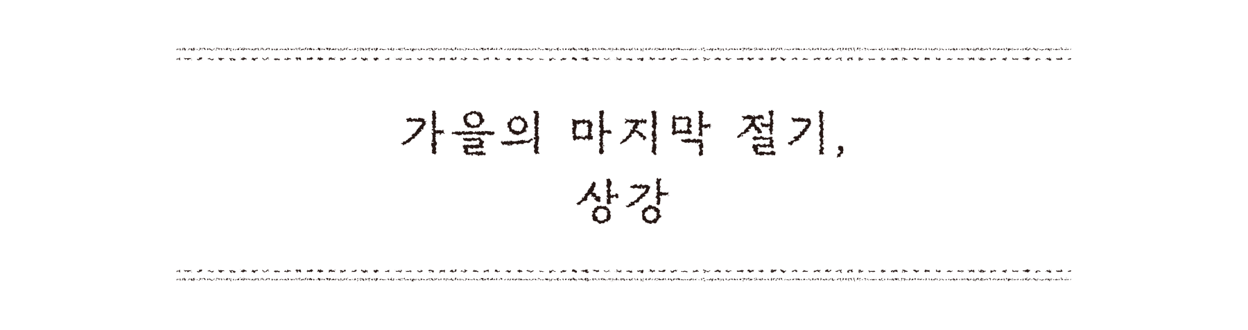 추수가 마무리되는 이 무렵, 농민들은 김장 채소 수확을 시작하는 등 겨울 채비에 들어가고, 낮과 밤의 기온 차가 커져 감 재배 농가들도 이즈음 곶감을 깎아 말리기 시작합니다. 단풍이 절정에 이르고 국화가 피는 가운데, 말 그대로 서리가 내려 추운 겨울이 가까워짐을 알리는 때이기도 하지요.
