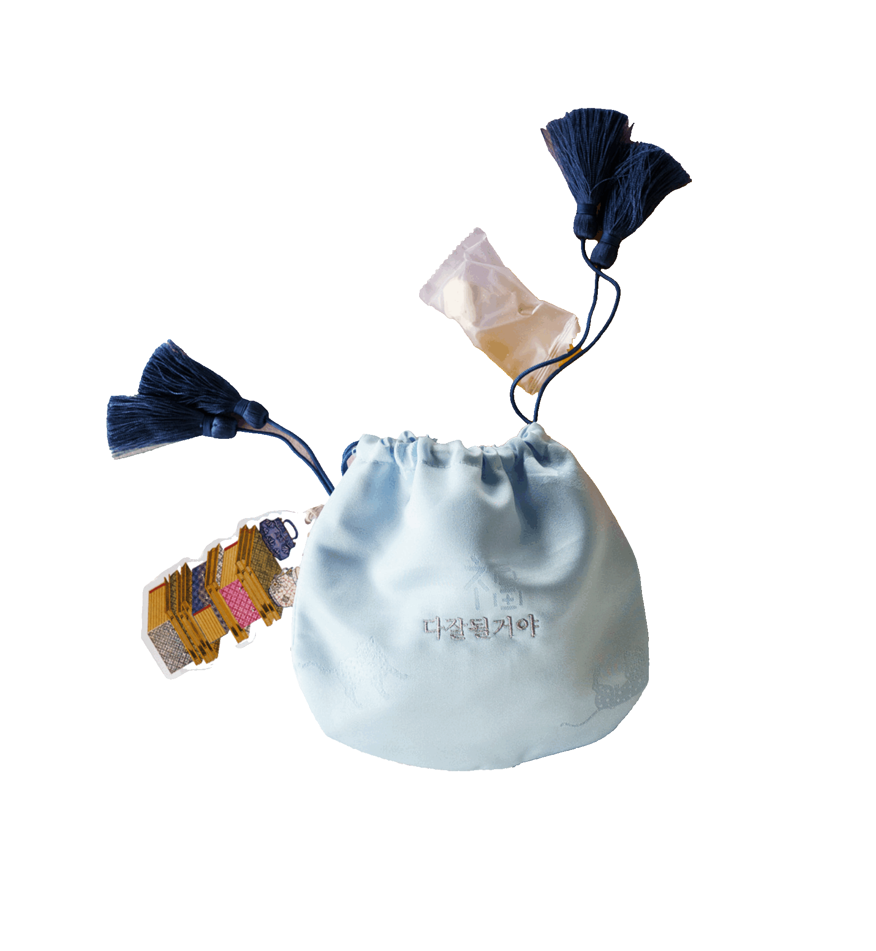 복주머니 형태의 합격엿 선물세트로, 자수 추가가 가능한 제품입니다. 원하는 응원의 주제에 맞게 '수능파이팅', ‘1종 합격’ 등의 메시지를 담아 건네보세요.