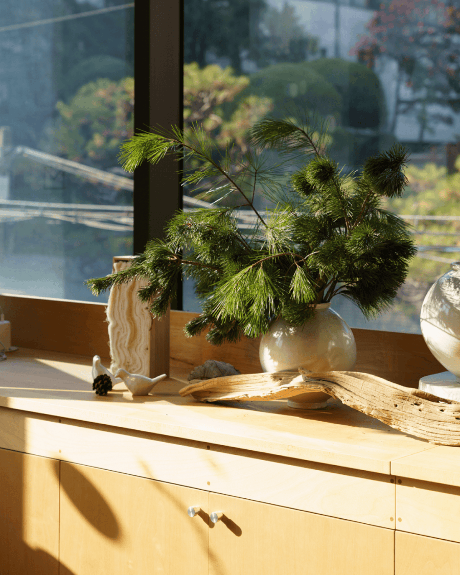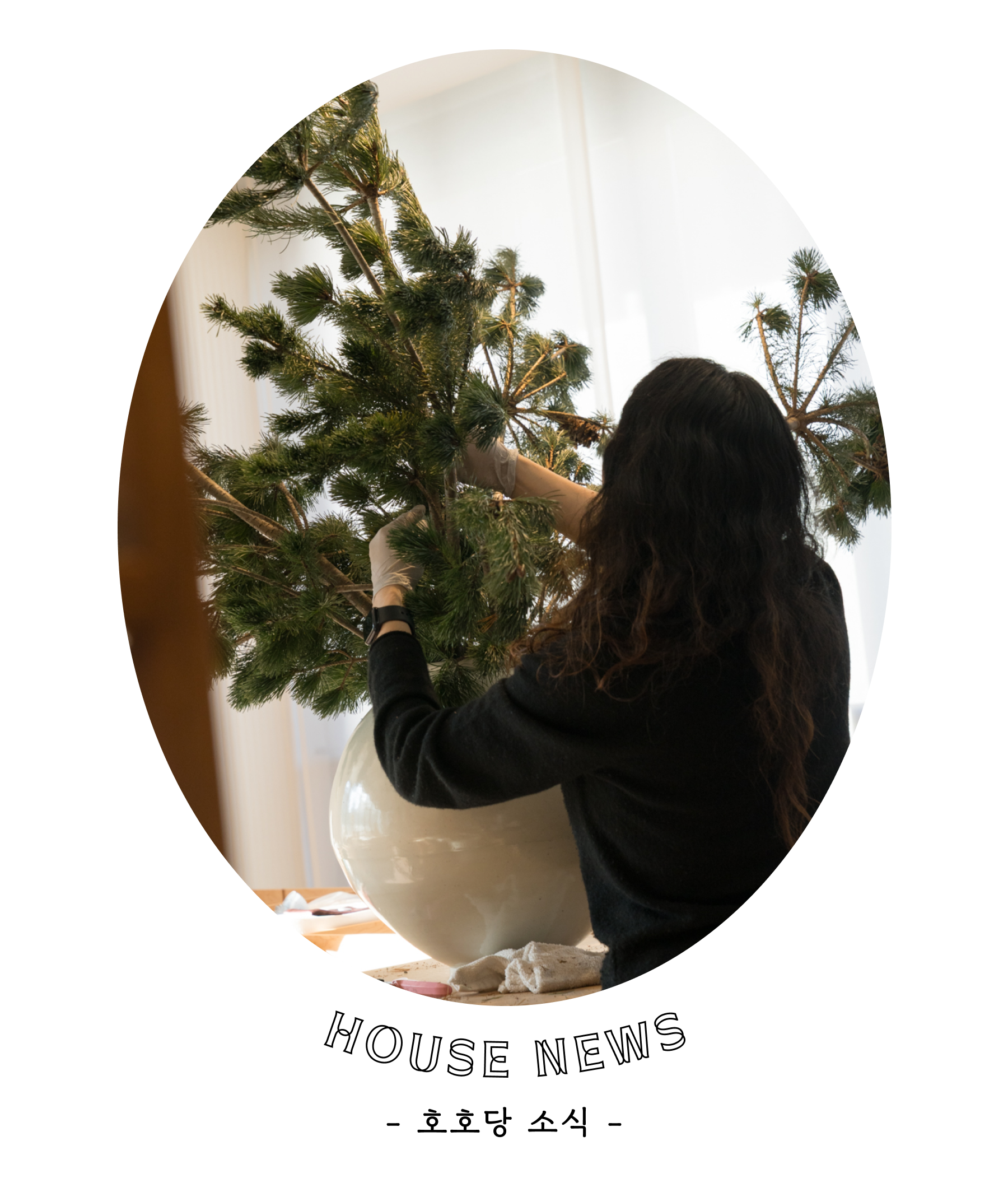 청담 매장에도 겨울의 기운이 내려앉고 있습니다. 새로 들인 소나무 위에 호호당의 보자기 오너먼트와 복을 부르는 금줄을 걸어두니 공간 전체가 겨울빛으로 깊게 물들었습니다. 손님들이 마음에 드는 오너먼트를 하나둘 데려가다 보니, 나무에 걸어둔 제품이 비어 다시 채워 걸기도 했답니다.