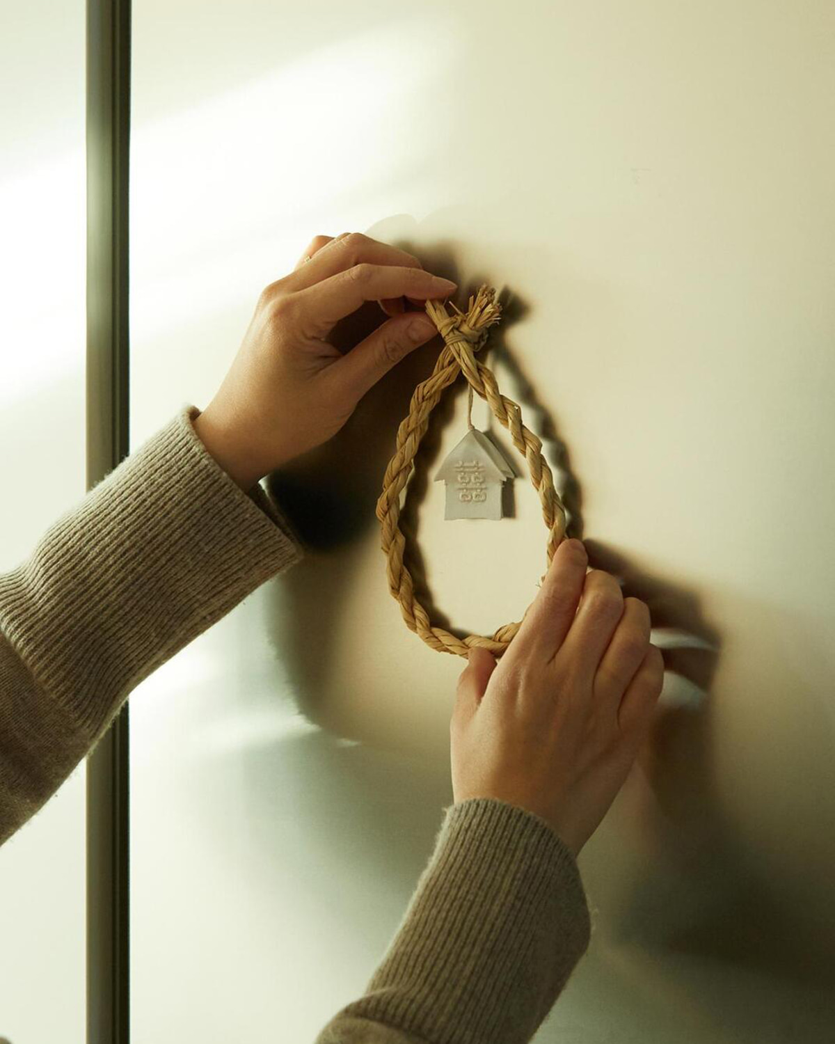 짚풀공예가 최석봉 장인이 둥글게 만 금줄에 행복이 가득하길 바라는 마음을 담아 수를 놓은 집 모양의 천을 달았습니다. 새로운 한 해를 기다리며 좋은 일만 집에 들어오라고, 금줄을 집 문 앞에 달아보세요.
