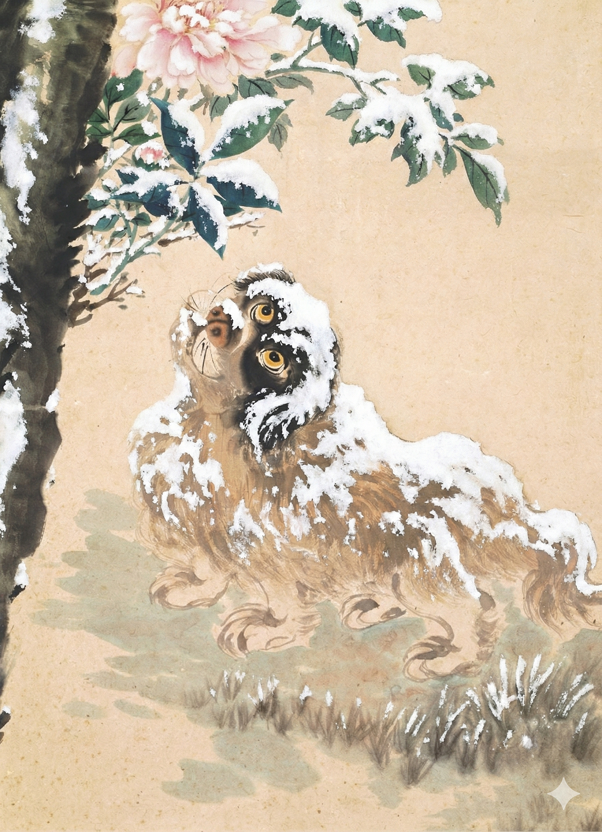 오늘은 호호당의 2026년 달력에 담긴 민화 중, 제가 특히 아끼는 한 점을 ‘오늘의 민화’로 골라 소개드립니다. 절기와는 다르게 포근한 날씨의 그림이라, 그림 위에 대설의 기운을 담아 하얀 눈을 소복하게 내려 주었어요.
